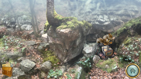 18、再跳到(场景32)把那一块不知道是什么的石头上的拉杠拉起来,会有4只鹅子飞起来(?),按照鹅子的顺序,解开鹅箱,得到放大镜;