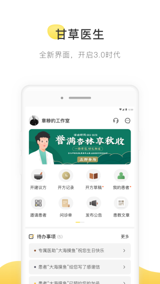 4、甘草医生:专为中医师设计的管理平台,便于管理患者和接收在线问诊。