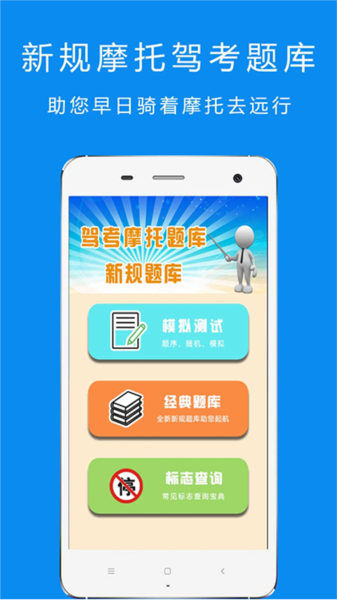 1、打开驾考摩托车科目一后,你将看到首页包含模拟测试、经典题库、标志查询三大功能选项。