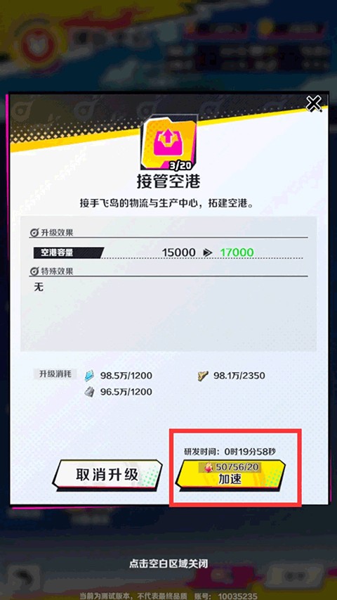 每次升级除了需要消耗资源以外,还需要等待一定的时间。这个过程也可以用一定数量的虹石进行加速。