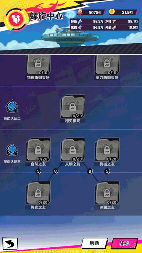 后勤建设以资源获取和加速研究螺旋中心为主,前期资源消耗较快,推荐升级几种资源的产出优化。