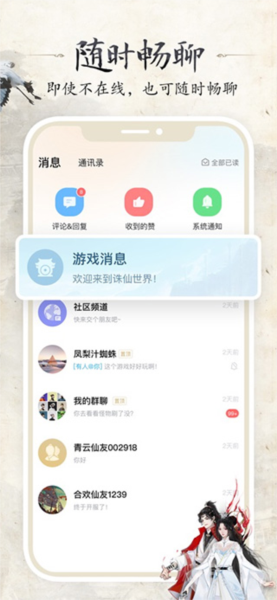 内置即时通讯功能,无论是否登录游戏,都能与好友随时互动交流。