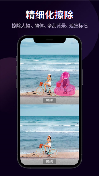 1、精细化擦除:高精度擦除工具,精准去除视频中的不需要元素,保持画面整洁。