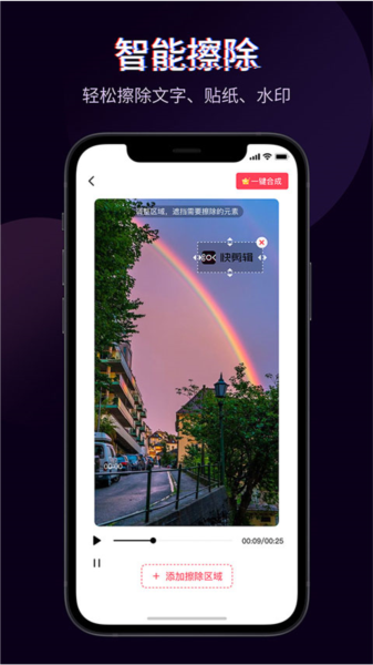 3、轻松擦除文字、贴纸、水印:快速去除视频中的文字、贴纸和水印,保证画面干净。