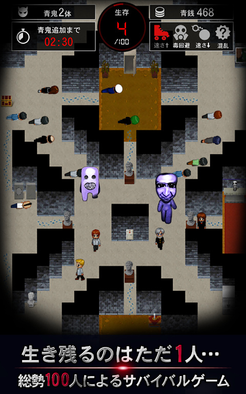 100名玩家和青鬼一起在线生成(这100名玩家中还包括NPC),玩家控制其中的一个角色,通过躲避青鬼的追击直到最后一个幸存者获胜。