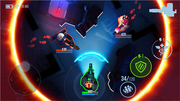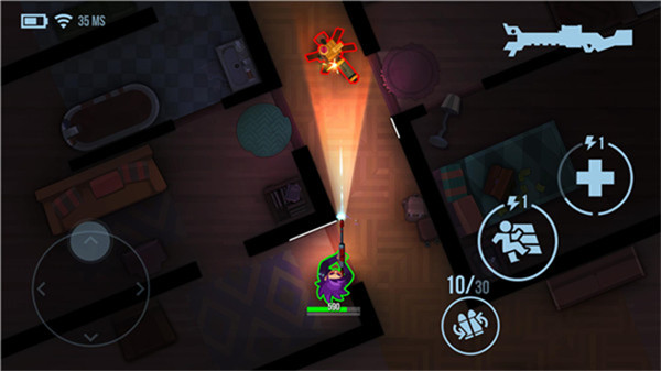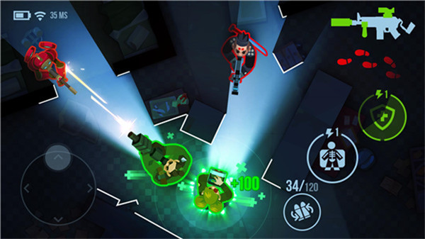 游戏采用俯瞰视角,左侧摇杆控制角色移动,右侧按键用于换弹、治疗等操作,简单易上手,非常适合新手玩家。