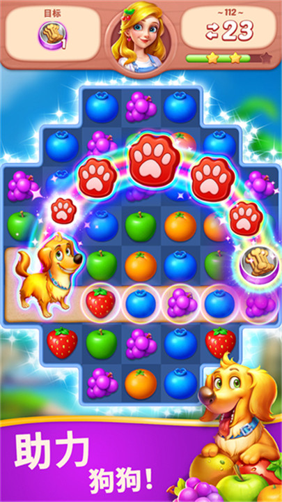 消除水果来收集新鲜可口的果汁,给狗狗带来更多的能量!