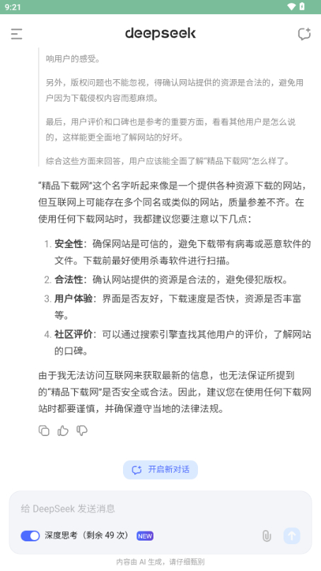 1、deepseek是基于人工智能技术的智能对话和知识搜索工具,旨在帮助用户快速获取信息并进行深入的分析。