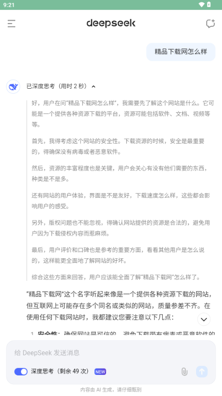下载deepseekv3(深度求索)手机版下载是智能化的AI对话服务工具,为用户提供便捷、高效的问答体验。deepseekv3手机版下载内置中文字幕,用户可以随时提出各种问题,系统将精准、高效地进行解答。 deepseekv3手机版支持在线定制专属的自定义接口,无需任何费用即可正常使用,非常贴心。系统还能智能记录用户的使用习惯和偏好,个性化推送相关内容,让体验更加贴合需求。此外,deepseekv3手机版还具备强大的内容生成功能,用户可以在线快速创建高质量的文章,满足多样化需求。