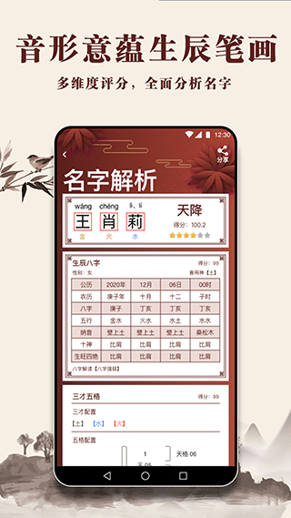 3、自动评分并解析名字的寓意和吉凶,帮助用户做出更有依据的选择。