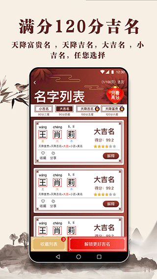 2、满分120分吉名:通过科学分析,为用户提供高分吉名,确保名字有助于运势。