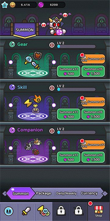 4. 在商城中点击召唤按钮,进行抽取并升级你的武器。如果任务失败也无需担心,只需将史莱姆放置在那里,继续挂机并升级属性即可。