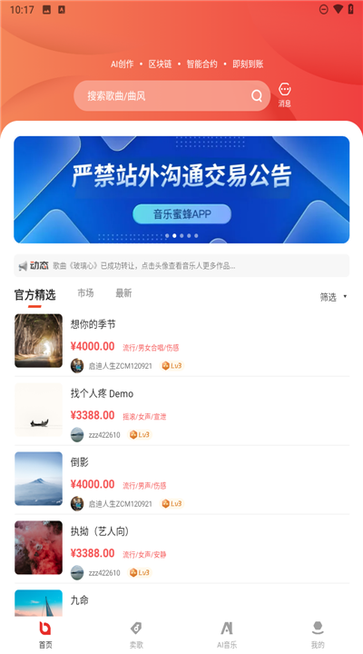 4. 成为音乐人后,你可以将自己亲手编曲、填词的作品卖给大家,分享你的创意和才华。