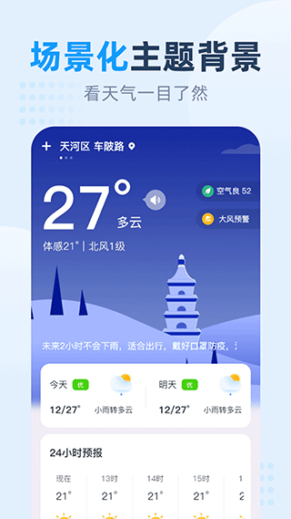 2、场景化主题背景:根据天气变化自动切换背景,让界面更具情境感,提升使用体验。