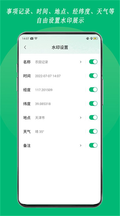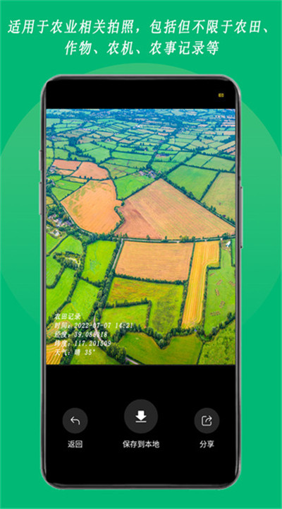 下载农用相机软件内置高精度定位,自动更新拍摄信息,减少手动输入的繁琐操作。照片可一键分享至社交平台,方便团队协作与远程管理。无论是农业生产记录还是外勤取证,农用相机都是你的得力助手,让农事管理更轻松,应用一次还能记录多个农田数据。
