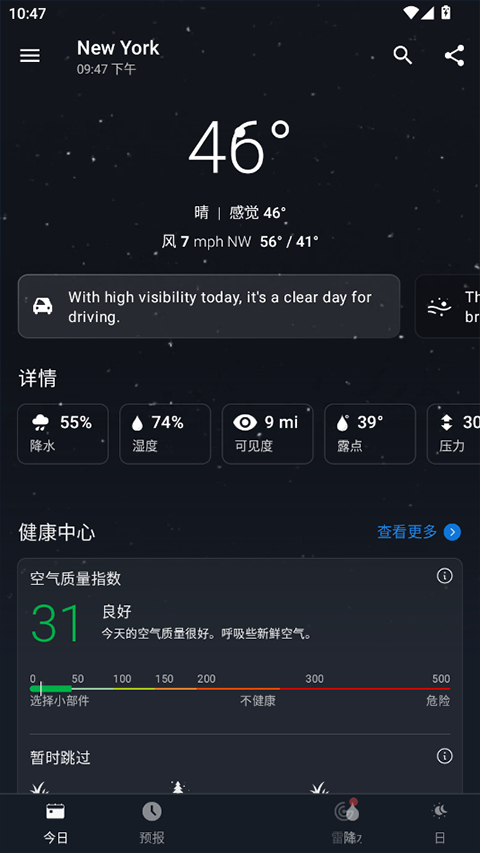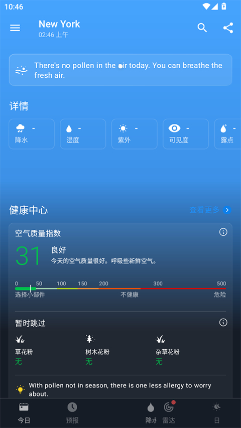 3、健康中心:查看空气质量指数、花粉和污染物数据,提供健康建议,助你保持健康。