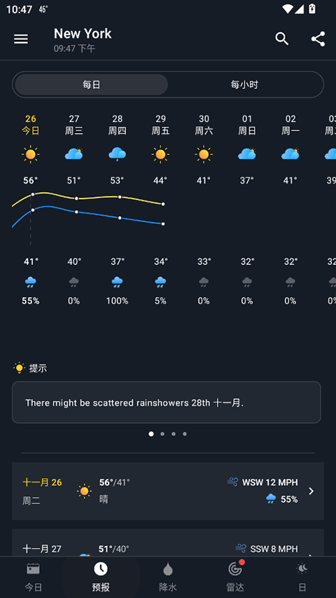 4、在线实时雷达:具备25+层次的天气图,实时追踪恶劣天气,确保你更安全地应对天气变化。