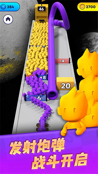 游戏的核心玩法是操作大炮发射炮弹人,带领他们与敌军展开激烈的战斗。炮弹人的数量和战斗力与倍增门的使用密切相关,如何精准地发射炮弹,最大化兵力的效能,成为取胜的关键。每一次发射都是战斗的开始,玩家需要不断调整炮弹的发射角度与时间,以确保在最合适的时机给予敌人致命一击。