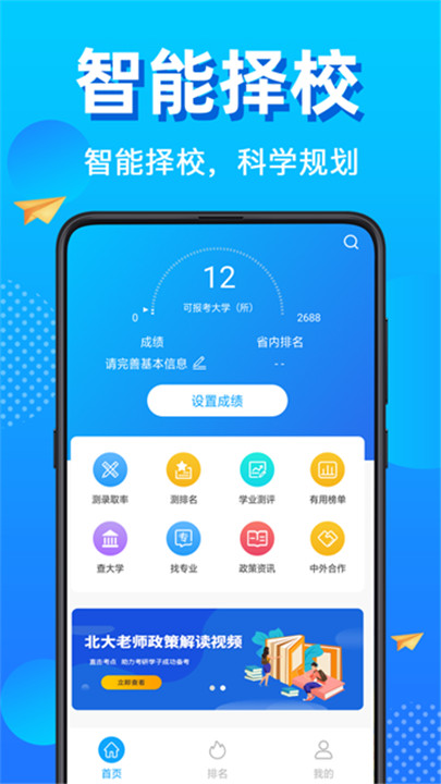 1. 在本站下载安装并打开高考志愿填报君,进入首页后,您将看到包括“测录取”和“测排名”等实用功能。