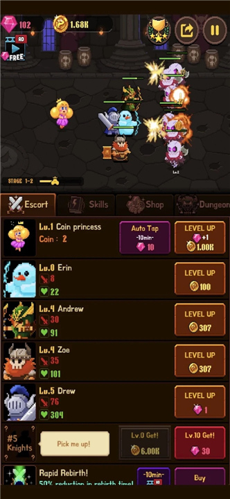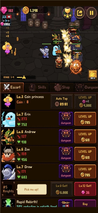4.需要注意的是,勇士每升五级时需要使用宝石,因此为了收集宝石,玩家可以通过不断挑战关卡或前往商店购买宝石。在击败关卡中的大魔王或升级公主时,都能获得宝石,完成关卡后分享也能得到宝石奖励。当然,你还可以在商店中购买宝石。游戏中的单数章节为逃亡模式,而双数章节为突破模式,玩家需要勇敢突破魔王军队,保护硬币公主。