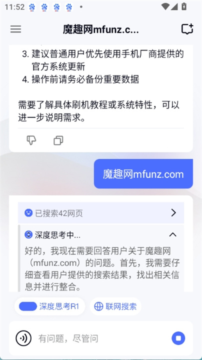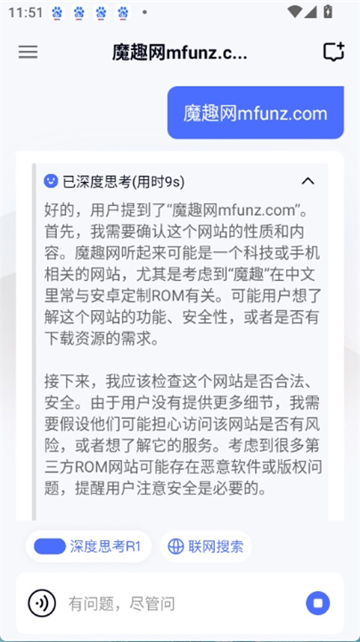 进入应用后,根据需求选择“深度思考R1”或“联网搜索”模式。