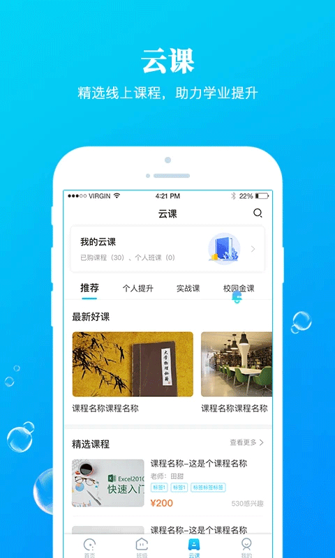4、云课:支持在线授课和学习,学生可以随时参加课程。