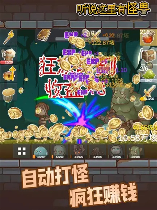 共有七种形态、18款不同造型的怪兽,支持手动和自动打怪模式。击杀怪兽可获得金币和经验。
