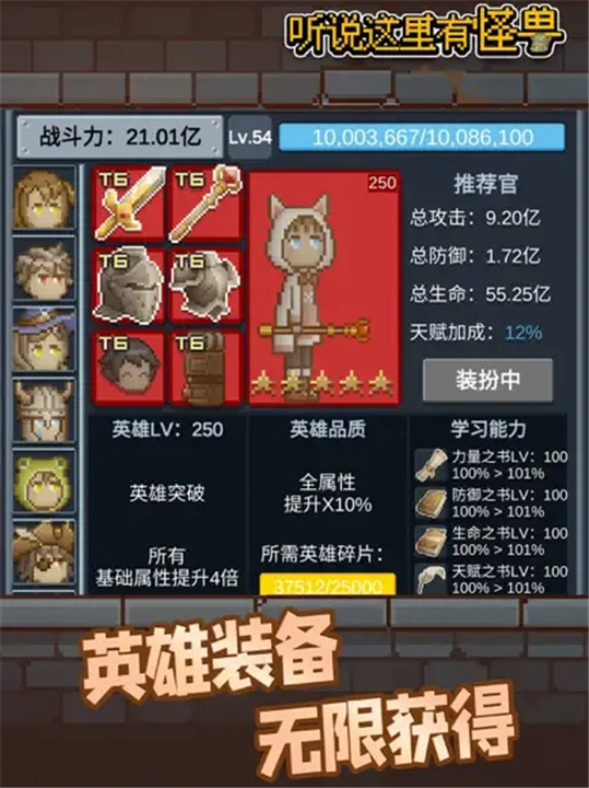 游戏初始提供6个英雄角色,通过击杀怪兽获得经验,提升角色等级并解锁装备。
