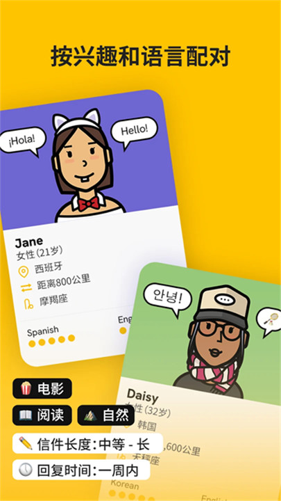 您可以编辑虚拟头像(捏脸)、填写个人简介(包括您的兴趣爱好、希望交友的笔友类型等)、填写基本信息、选择感兴趣的话题、设定语言偏好,还可以通过配对设置来筛选不感兴趣的话题和国家,并选择年龄段范围。