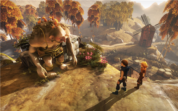 5、通过农舍之后,经过之前路过的粮仓上方,看到一个在哭的巨人。剧情结束后,跟着巨人走,巨人会帮助兄弟二人翻越路上的障碍。踩着巨人肩膀过河后,爬到对面的枯藤上,等待巨人从下面爬上来,再从巨人肩膀上爬过。让巨人将兄弟二人扔至对面后,爬到一个平台上,等待巨人张开双手后与他互动。巨人会带着兄弟二人跳下瀑布。