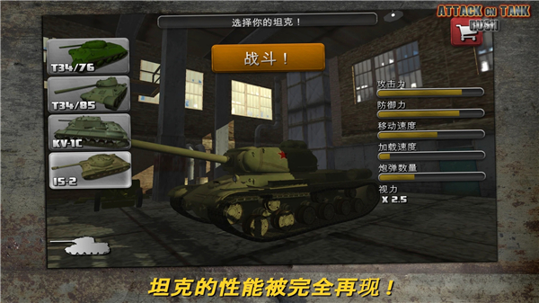 1、进入游戏后,首先点击游戏主界面上的“征战”按钮,进入游戏的挑战模式,准备开始激烈的坦克战斗,选择你想要挑战的关卡和敌人。