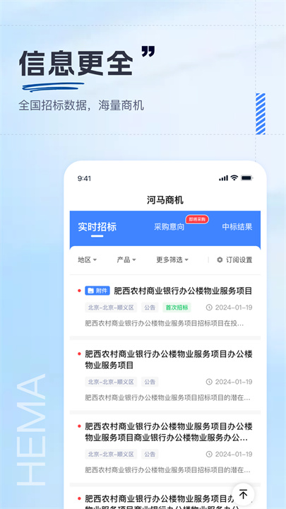 河马商机app每天都会推送超过100,000条招标与采购数据,涵盖建筑工程、医疗、教育、环保、制造业等各大行业。这样庞大的信息量,让用户可以根据自身业务范围,有针对性地挑选适合自己的项目。