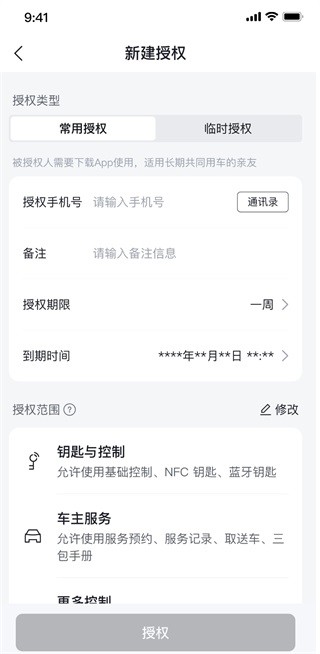 3、填写被授权人注册的手机号,选择授权期限和授权范围(如钥匙与控制、车主服务、更多控制、隐私功能等)。按“授权”并完成相应验证后,授权完成。