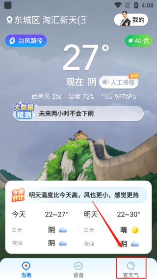 1、打开心悦天气后,点击下方的“查天气”选项。