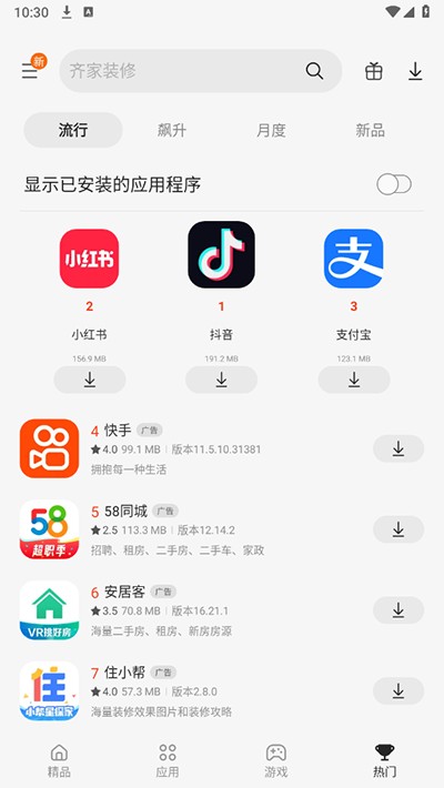 3、排行功能:展示热门应用排行榜。
