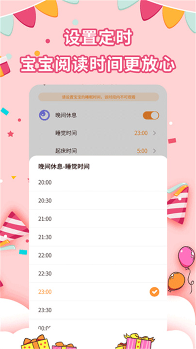 可设定孩子的休息时间和起床时间,比如晚上9:30到早上8:30之间禁止使用APP。在这个时间段内,所有绘本内容将无法播放,确保孩子按时休息,不被电子设备干扰。
