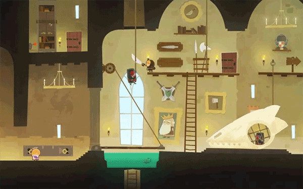 5. 这一关要偷的是右边的海报,但中间根本没路,还挡着个士兵! 这时候走到升降台的绳子旁,会冒出一个操作按钮,只要把绳子松开,升降台会降下来,士兵也顺势离开,海报就轻松收入囊中啦。