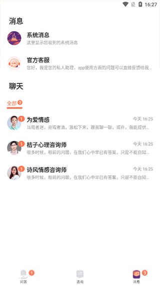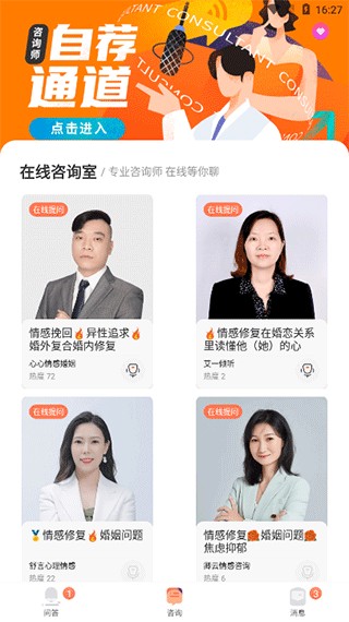 2、咨询功能:可申请成为咨询师,或查找合适的情感导师进行一对一问题咨询。
