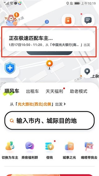 3、登录车主端,设置起点、终点及出发时间,系统自动匹配顺路订单。