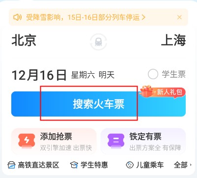 1、打开高铁管家,在首页输入出发地和目的地,选择出发日期,点击“搜索火车票”。