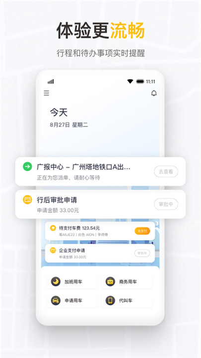 登录企业App后,员工可使用企业支付功能根据实际出行场景预约车辆,费用自动结算至企业账户(如符合规则)。
