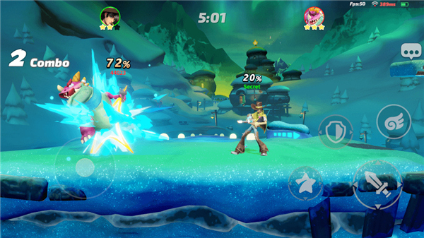 3、战斗发生在空中平台上,边缘为死线,若被击至死线区域将被击飞出场,需要时刻注意自身站位。