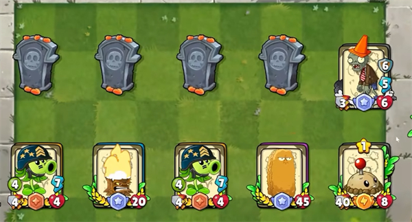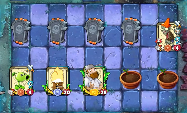 4、通过将植物卡牌安置于花盆区域进行部署,每张卡牌均设有生命值与攻击力数值。
