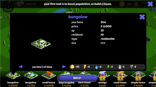 2、在游戏页面中,你可以选择多种不同风格的房屋图像,自由购买和布置建筑,打造独特的城市景观。