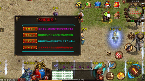 1、玩家上线第一步先开启免费泡点,下新手十倍秒升55级。