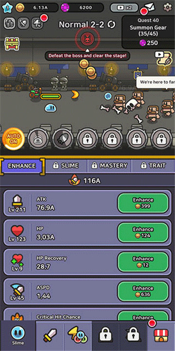 4、点击“召唤”按钮,即可抽取并升级武器。即使任务失败也无需担心,只需继续放置挂机,稳步提升史莱姆的属性即可。