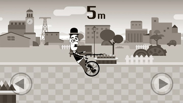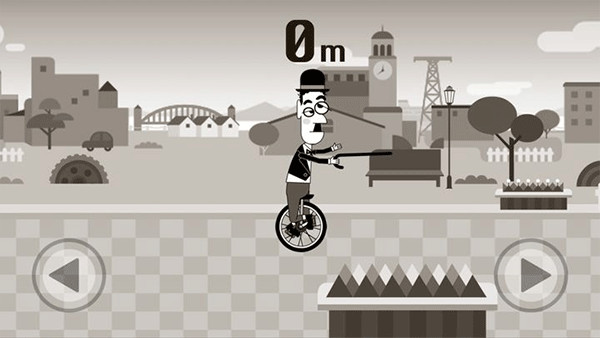 3、玩家控制喜剧大师卓别林骑着独轮车前进,但是要注意别让他从车上摔下来。