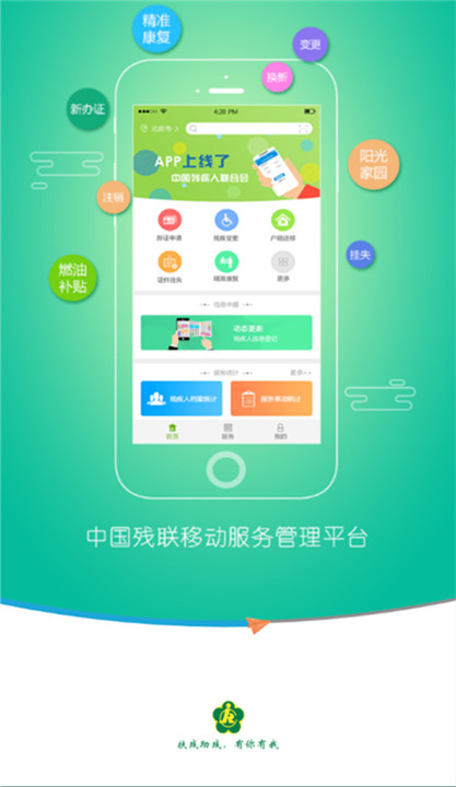 4、持证残疾人通过APP注册并成功登录后,可实现在线申请“精准康复”“阳光家园”“燃油补贴”“家庭无障碍改造”“长江假肢”等服务(上述服务项目正在建设中,开通后另行下文通知);未持证残疾人,也可通过该APP自助申请办理残疾人。