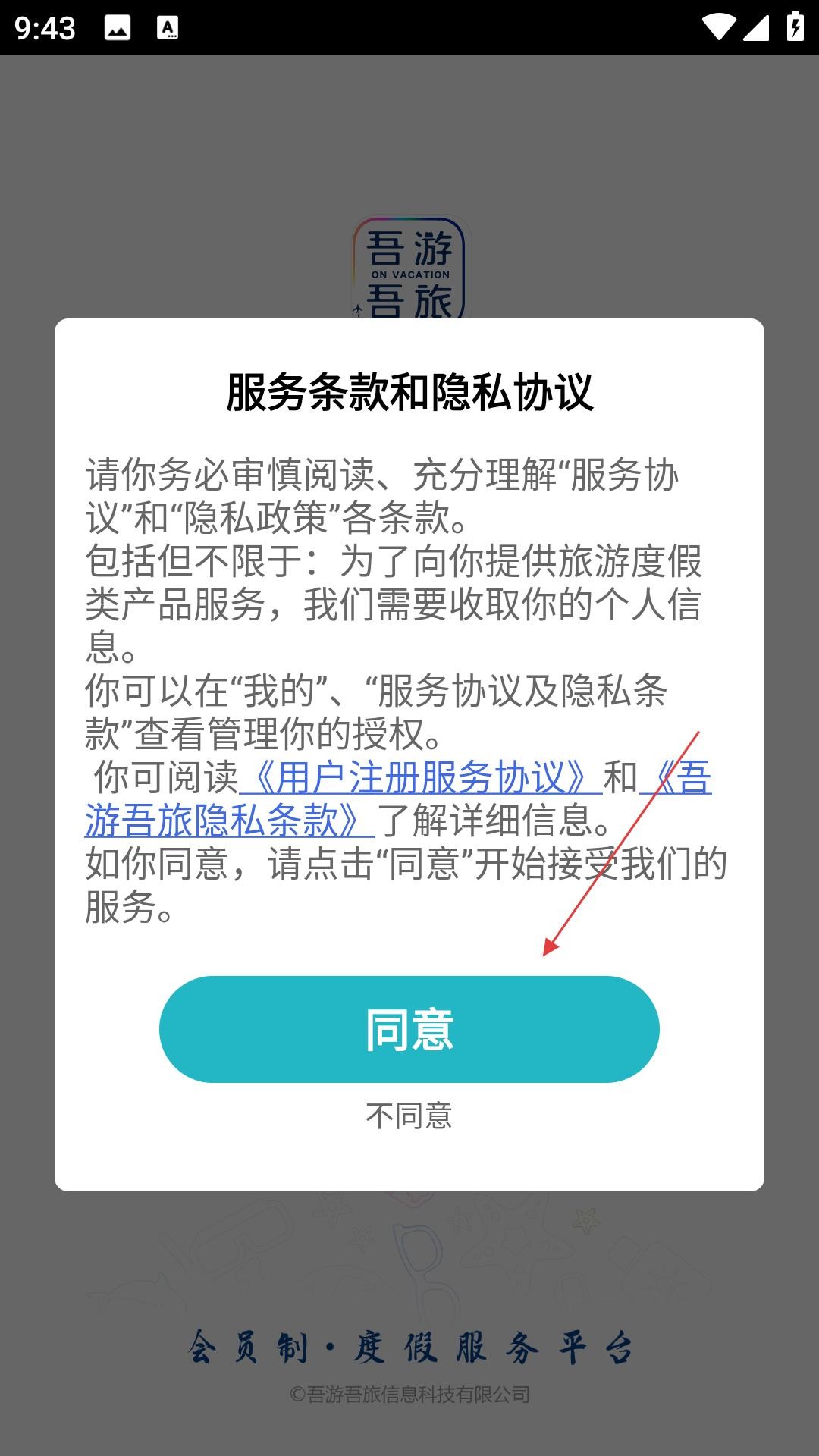 1、使用吾游吾旅,点同意,接受协议,进入首页,选会员服务,如酒店预订、景点门票,规划度假行程。
