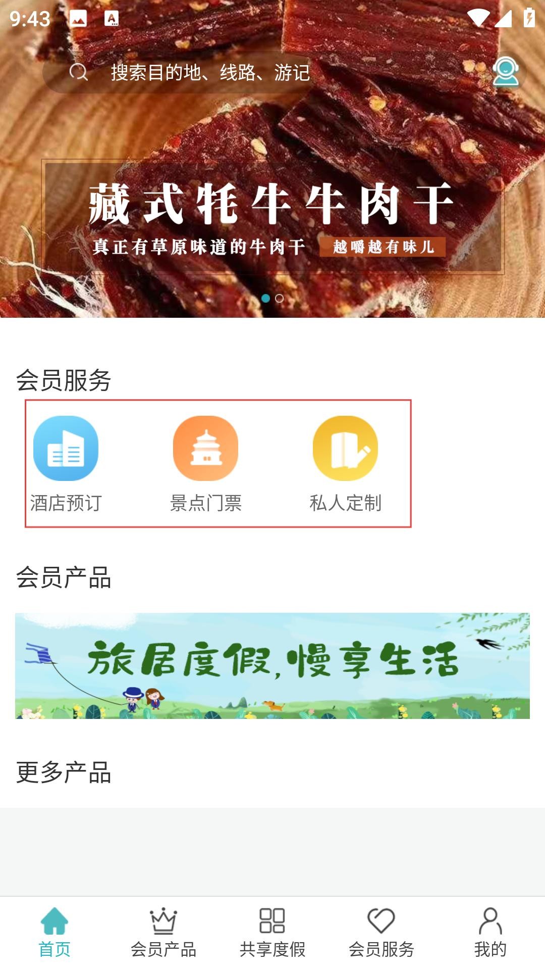 2、在协议页点同意,进首页,用搜索找目的地,看会员产品,选旅居度假,享受慢生活服务。